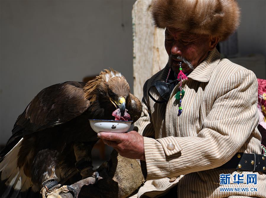 6月29日,庫(kù)爾馬西·胡特曼在家中給獵鷹喂食鮮羊肉。新華社記者宋彥樺攝