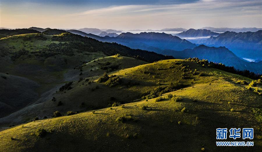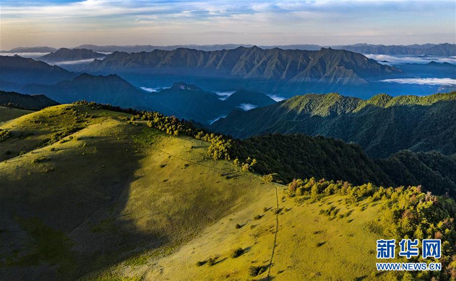 6月30日,朝霞照耀下的神田草甸與遠(yuǎn)處的群峰(無(wú)人機(jī)照片)。位于陜西省安康市嵐皋縣與重慶市城口縣交界處大巴山神田主脊北坡的神田草甸,面積超過(guò)1.1萬(wàn)畝。夏日的朝霞中,起伏的草甸仿佛一塊寬大無(wú)邊的綠色地毯,鑲嵌在大巴山上,如詩(shī)如畫(huà)。新華社記者陶明攝