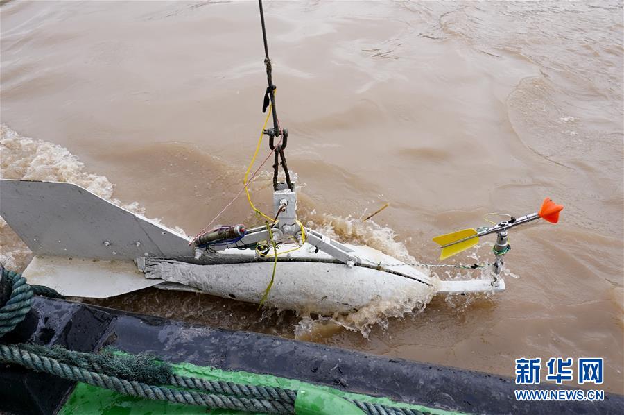 7月2日,裝有流速測(cè)量?jī)x器的鉛魚(yú)完成測(cè)量作業(yè)后,由吊車(chē)吊出長(zhǎng)江水面。新華社記者劉潺攝