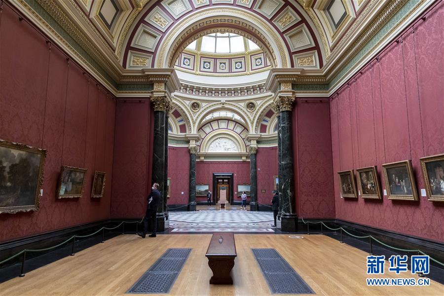 7月4日,參觀者佩戴口罩在英國國家美術(shù)館的媒體開放日上參觀。受新冠疫情影響而關(guān)閉的英國國家美術(shù)館將于7月8日重新對公眾開放,成為倫敦首批開門迎客的博物館、美術(shù)館。參觀者需提前網(wǎng)上預(yù)約參觀時段,全程佩戴口罩且保持安全距離。新華社記者韓巖攝