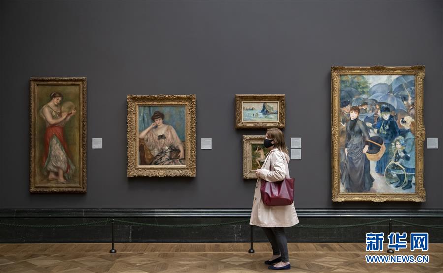 7月4日,參觀者佩戴口罩在英國(guó)國(guó)家美術(shù)館的媒體開放日上參觀。受新冠疫情影響而關(guān)閉的英國(guó)國(guó)家美術(shù)館將于7月8日重新對(duì)公眾開放,成為倫敦首批開門迎客的博物館、美術(shù)館。參觀者需提前網(wǎng)上預(yù)約參觀時(shí)段,全程佩戴口罩且保持安全距離。新華社記者韓巖攝