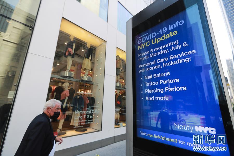 7月4日,一名行人從美國紐約第五大道顯示新冠疫情最新情況的信息屏旁經(jīng)過。當日是美國獨立日,美國多地疫情仍面臨嚴峻形勢。美國約翰斯·霍普金斯大學實時統(tǒng)計數(shù)據(jù)顯示,美國累計新冠確診病例4日已超過280萬例。新華社記者王迎攝