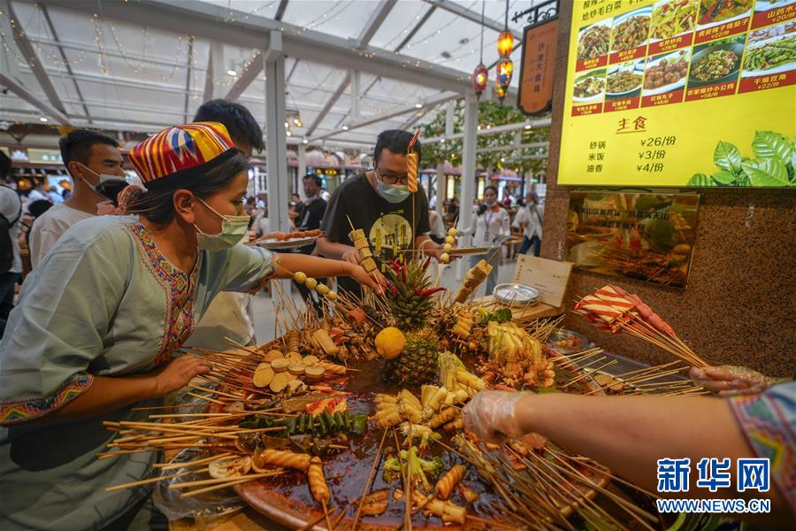 游客在烏魯木齊大巴扎景區(qū)挑選麻辣燙(7月4日攝)。夏日周末,烏魯木齊市大巴扎景區(qū)內熙熙攘攘,人們來到這里品嘗美食、休閑購物。2018年,經過靚化改造后的大巴扎景區(qū)新增長約800米的步行街,分為文創(chuàng)文旅和“非遺”項目街區(qū)、國際時尚街區(qū)和大巴扎美食街區(qū),是烏魯木齊最受歡迎的旅游目的地之一。新華社記者趙戈攝