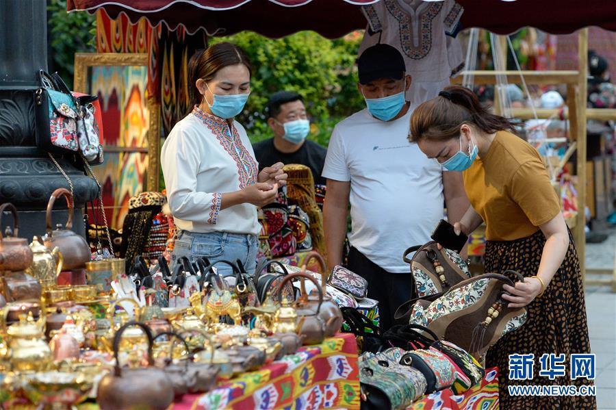 游客在烏魯木齊大巴扎景區(qū)選購(gòu)商品(7月4日攝)。夏日周末,烏魯木齊市大巴扎景區(qū)內(nèi)熙熙攘攘,人們來到這里品嘗美食、休閑購(gòu)物。2018年,經(jīng)過靚化改造后的大巴扎景區(qū)新增長(zhǎng)約800米的步行街,分為文創(chuàng)文旅和“非遺”項(xiàng)目街區(qū)、國(guó)際時(shí)尚街區(qū)和大巴扎美食街區(qū),是烏魯木齊最受歡迎的旅游目的地之一。新華社記者丁磊攝