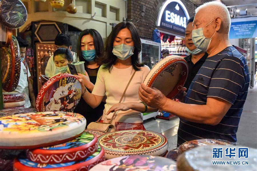 游客在烏魯木齊大巴扎景區(qū)購(gòu)買手鼓(7月4日攝)。夏日周末,烏魯木齊市大巴扎景區(qū)內(nèi)熙熙攘攘,人們來(lái)到這里品嘗美食、休閑購(gòu)物。2018年,經(jīng)過(guò)靚化改造后的大巴扎景區(qū)新增長(zhǎng)約800米的步行街,分為文創(chuàng)文旅和“非遺”項(xiàng)目街區(qū)、國(guó)際時(shí)尚街區(qū)和大巴扎美食街區(qū),是烏魯木齊最受歡迎的旅游目的地之一。新華社記者丁磊攝
