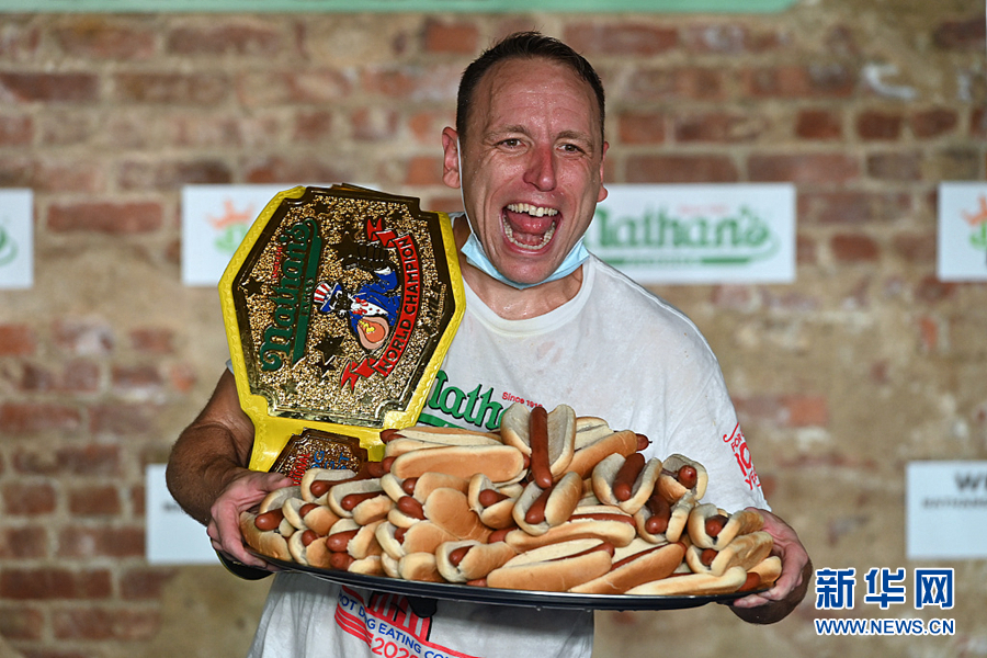 7月4日,美國紐約布魯克林舉行一年一度的國際吃熱狗比賽,喬伊·切斯納特以吃75個(gè)熱狗的成績贏得男子賽區(qū)冠軍,創(chuàng)下了新的世界紀(jì)錄。(圖片來源:視覺中國)
