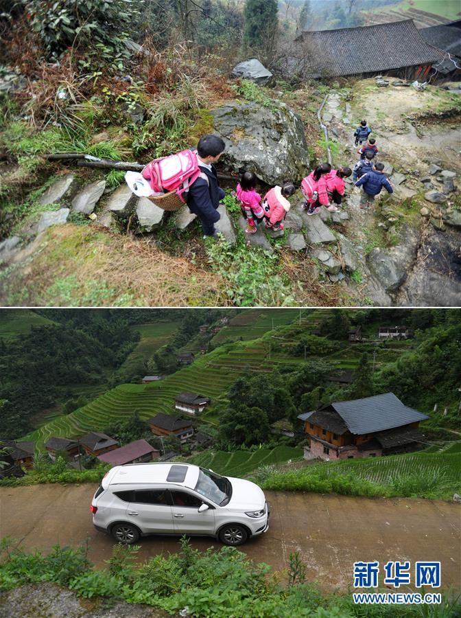 這是一張拼版照片,上圖:在廣西龍勝龍脊鎮(zhèn)江柳村,余啟貴老師背著背簍領(lǐng)著學(xué)生去學(xué)校(2013年2月26日攝);下圖:在廣西龍勝龍脊鎮(zhèn)江柳村,余啟貴老師開著自己的汽車帶著學(xué)生去學(xué)校(7月7日攝)。新華社記者陸波岸攝