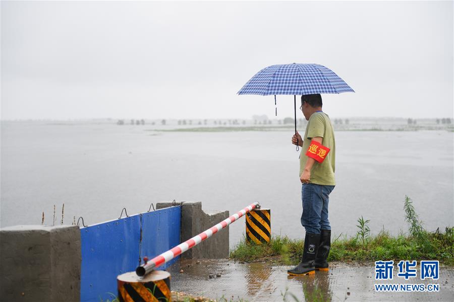 工作人員在益陽市大通湖區(qū)東大堤巡查(7月8日攝)。新華社記者陳澤國攝
