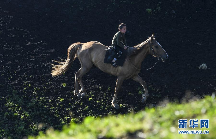 在新疆特克斯縣境內(nèi)的夏牧場里,一名小朋友在草場上騎馬(7月2日攝)。新華社記者王菲攝