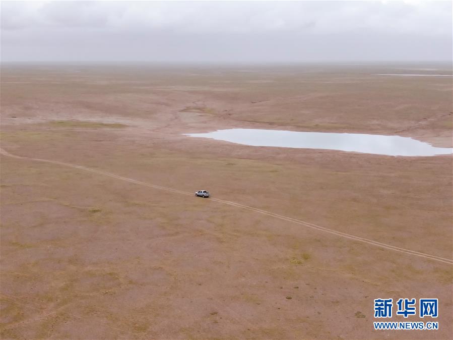 在可可西里索南達(dá)杰保護(hù)站管護(hù)區(qū)域,龍周才加與隊(duì)友們乘車巡視(6月30日攝,無人機(jī)照片)。新華社記者 張龍 攝