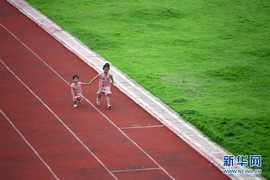 7月16日,在安徽省宿松縣洲頭鄉(xiāng)中心小學(xué)集中安置點(diǎn),小朋友在操場(chǎng)上玩耍。新華社記者劉軍喜攝