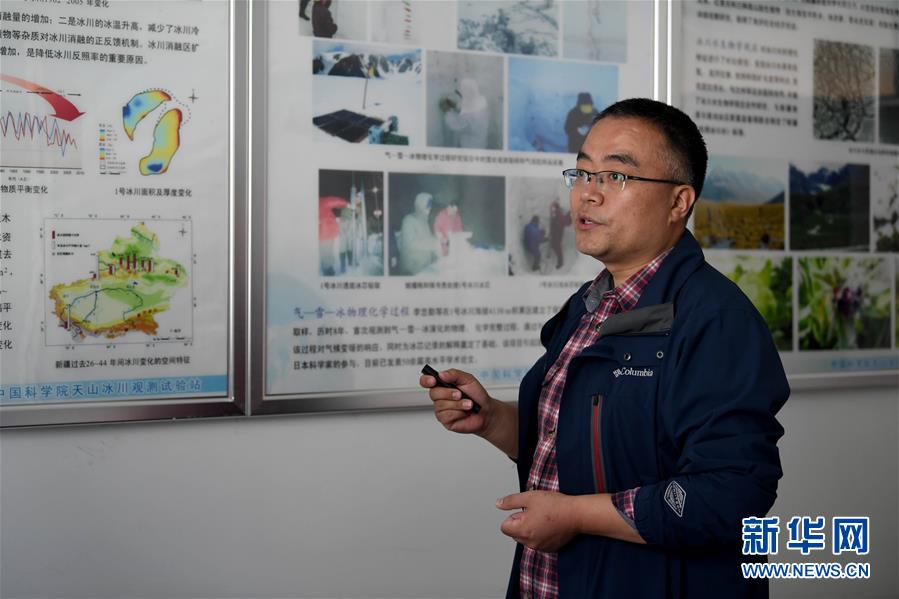 7月16日,中國(guó)科學(xué)院西北生態(tài)環(huán)境資源研究院天山冰川觀測(cè)試驗(yàn)站工程師周平介紹天山一號(hào)冰川情況。新華社記者沙達(dá)提攝