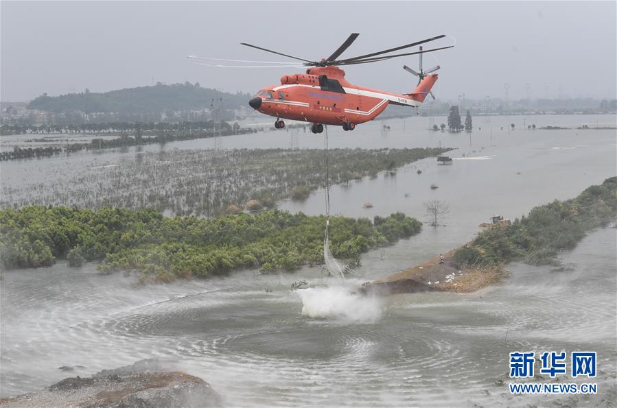 7月16日,湖北省應(yīng)急管理廳緊急調(diào)度直升機(jī),在湖北省陽(yáng)新縣富河干堤葵賽湖下垸潰口上空,空投網(wǎng)兜石塊。新華社記者程敏攝