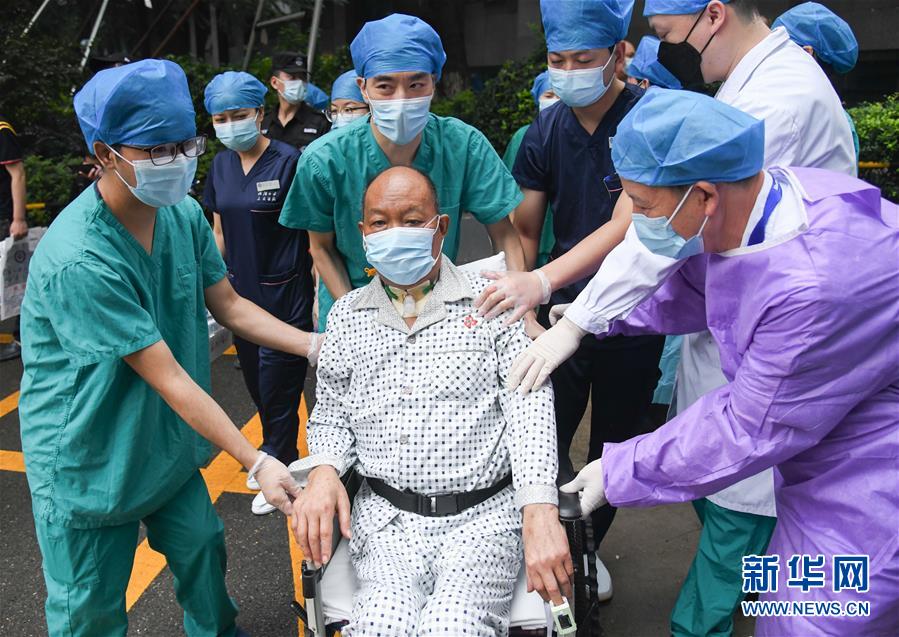 7月21日,武漢大學(xué)人民醫(yī)院醫(yī)護人員護送崔先生出院。新華社記者程敏攝