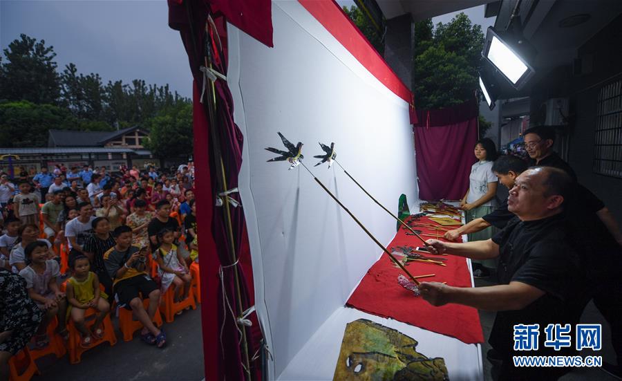 當(dāng)日,浙江省杭州市余杭區(qū)塘棲鎮(zhèn)河西埭村“衛(wèi)家班皮影戲”劇團(tuán)的藝人們來到余杭區(qū)喬司街道和睦橋村進(jìn)行演出,這是近期杭州市余杭區(qū)夏季鄉(xiāng)村“文化走親”的重要活動(dòng)之一。今年6月開始,杭州市余杭區(qū)塘棲鎮(zhèn)組織多支文化表演團(tuán)體以“文化走親”的形式,先后送戲到余杭區(qū)近20個(gè)鄉(xiāng)村文化禮堂,豐富夏日鄉(xiāng)村百姓文化生活。在余杭塘棲一帶,歷史上曾活躍著一支以演出皮影戲出名的民間戲班子,號(hào)稱“衛(wèi)家班”。2016年,塘棲鎮(zhèn)河西埭村在文化禮堂的建設(shè)過程中,將當(dāng)?shù)貍鹘y(tǒng)的“衛(wèi)家班皮影戲”作為“一村一品”特色項(xiàng)目進(jìn)行了搶救性保護(hù)。2018年12月,“衛(wèi)家班皮影戲”被列入杭州市非物質(zhì)文化遺產(chǎn)代表性項(xiàng)目名錄。新華社記者徐昱攝