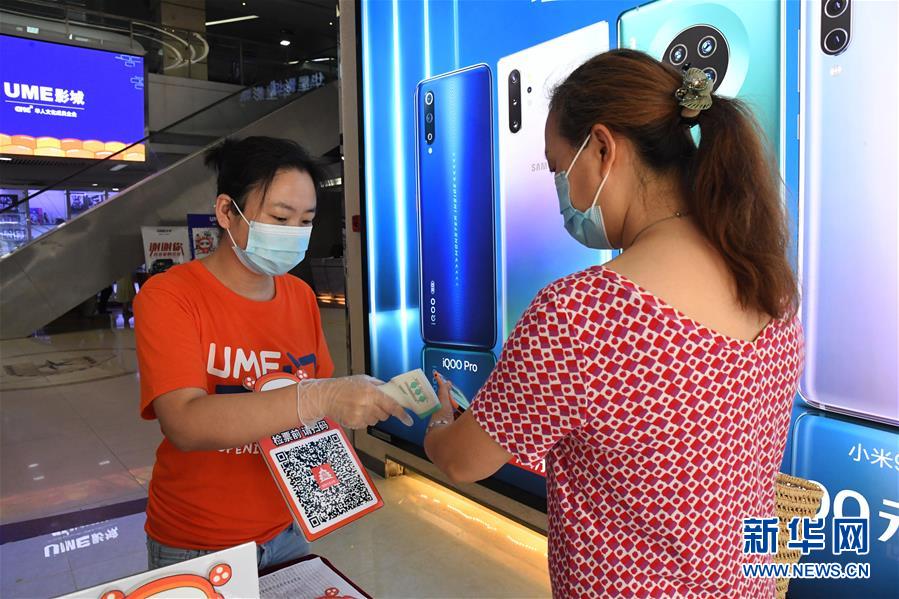 7月24日,在UME影城北京華星店,工作人員(左)為觀眾測(cè)量體溫。當(dāng)日,在做好新冠肺炎疫情防控的前提下,北京市部分電影院有序恢復(fù)開(kāi)放。新華社記者 任超 攝