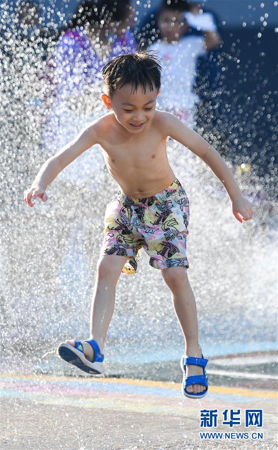 7月24日,一名小男孩在北京華熙LIVE·五棵松商業(yè)街區(qū)的一處噴泉戲水。北京市氣象局7月24日傍晚發(fā)布稱,24日截至16時30分,平原大部分地區(qū)出現(xiàn)37℃以上高溫天氣,局地氣溫超過40℃。北京市已于23日發(fā)布高溫藍色預(yù)警,預(yù)計25日全市大部分地區(qū)日最高氣溫仍將達35℃以上。新華社記者陳曄華攝