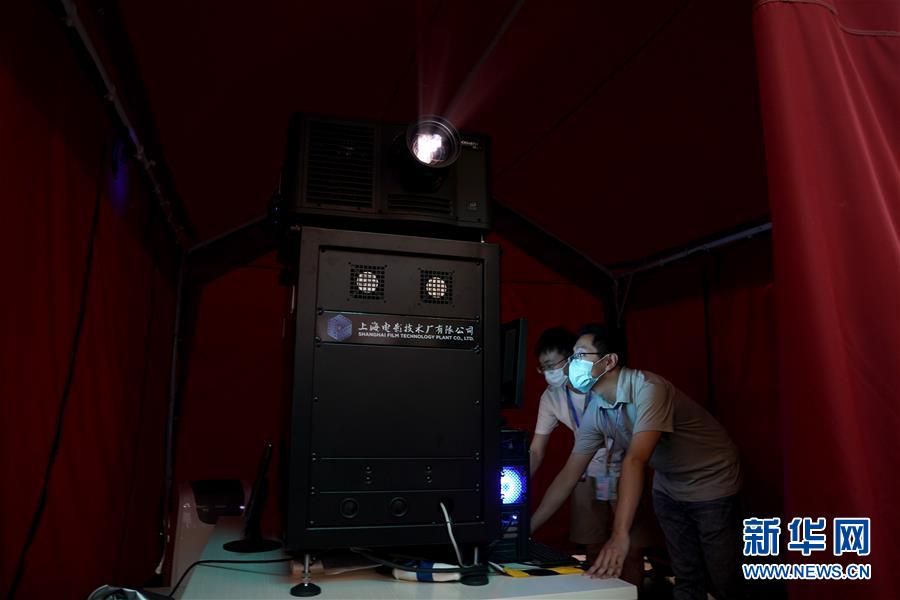 7月25日,在上海大寧音樂廣場(chǎng)的露天電影展映現(xiàn)場(chǎng),放映人員在工作。新華社記者 劉穎 攝