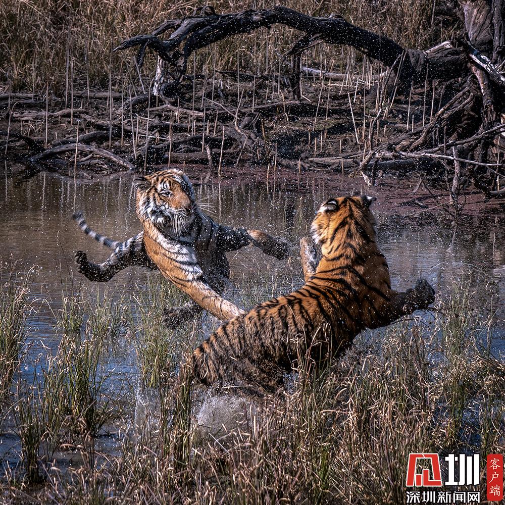2020年7月27日,猛虎斗有多壯觀?來自印度德里的41歲職業(yè)業(yè)攝影師Nitish Madan,在在印度北部倫滕波爾國家公園游覽時(shí),見證了兩只老虎幼崽激烈的水上爭(zhēng)奪戰(zhàn)。從畫面中可以看到,兩只足足有200磅重的孟加拉虎,面對(duì)面互相咆哮,伸出虎爪兇猛至極,才15個(gè)月大就已經(jīng)有了王者風(fēng)范。