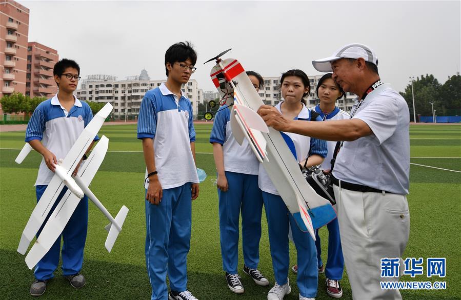 7月27日,老師在天津中學(xué)操場上給參加暑期實(shí)踐營的學(xué)生講解航模知識(shí)。新華社記者 李然 攝
