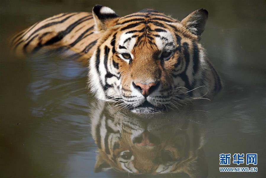 7月28日在橫道河子?xùn)|北虎林園拍攝的在水中納涼的東北虎。時(shí)值盛夏,位于黑龍江省海林市的橫道河子?xùn)|北虎林園的東北虎活動(dòng)量減少,以不同方式消夏納涼。新華社記者王建威攝