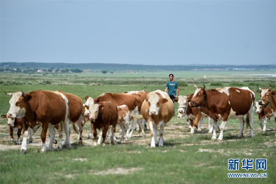 呼格吉勒在牧場(chǎng)放牛(7月23日攝)。新華社記者劉磊攝