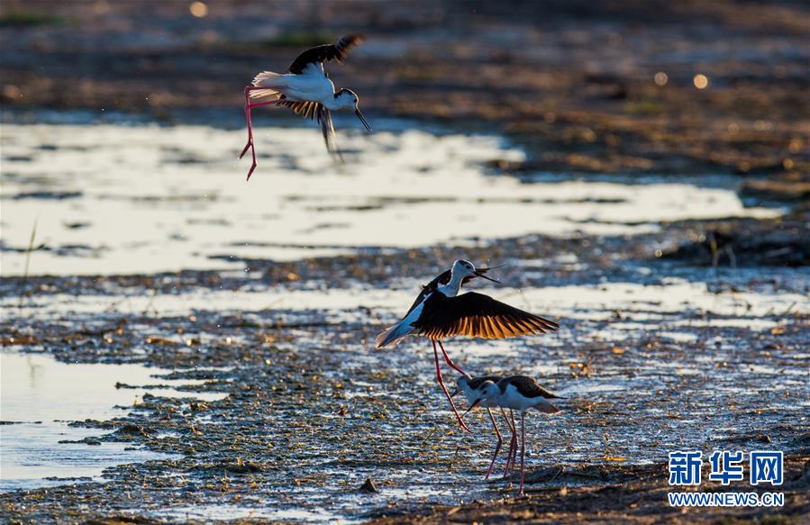 7月28日,在鄂爾多斯?jié)竦靥伊R—阿拉善灣海子,兩只長腳鷸在爭斗。鄂爾多斯?jié)竦匚挥趲觳箭R沙漠、毛烏素沙地接壤地帶,2002年被列入國際重要濕地名錄。從2006年開始,由于濕地湖面萎縮、湖心島消失,在此筑巢繁殖的世界瀕危物種遺鷗幾近消失。近年來,當(dāng)?shù)夭扇《喾N治理措施,濕地生態(tài)環(huán)境逐步好轉(zhuǎn)。2019年起,濕地內(nèi)的桃力廟—阿拉善灣海子迎來遺鷗大規(guī)?!盎貧w”。如今,40多種鳥類在此棲息,鄂爾多斯?jié)竦刂匦鲁蔀轼B類的樂園。新華社記者連振攝
