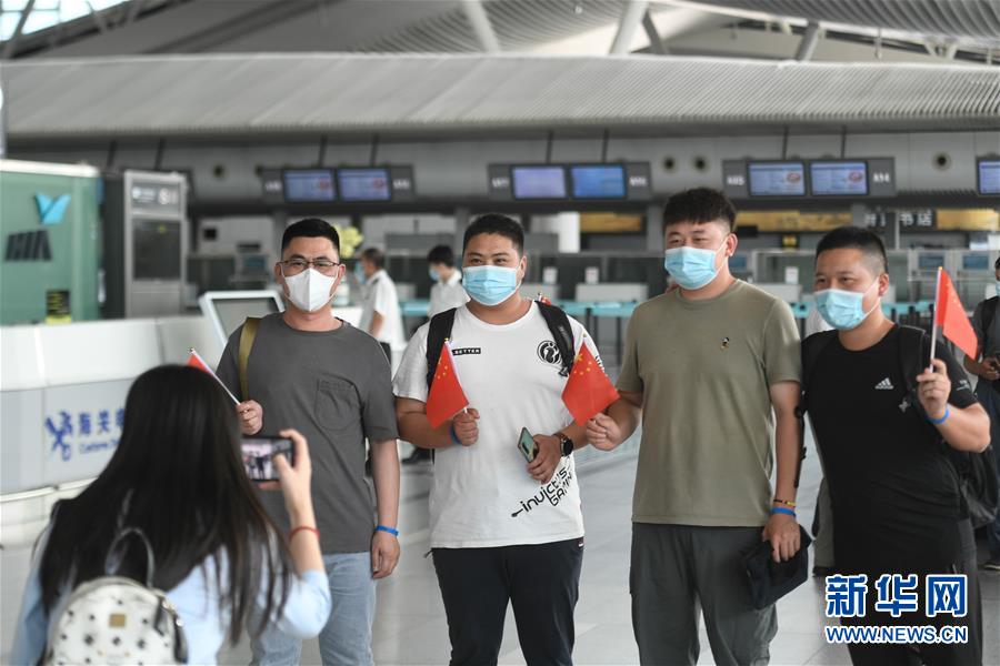 7月29日,在杭州蕭山國際機場,電力工程技術(shù)人員在進入安檢通道前合影。當日,中國能源建設(shè)集團浙江火電建設(shè)有限公司的113名電力工程技術(shù)人員在杭州蕭山國際機場集結(jié),啟程飛赴印度尼西亞首都雅加達。他們將重新投入到印尼多個“一帶一路”重點工程的建設(shè)中。新華社記者黃宗治攝