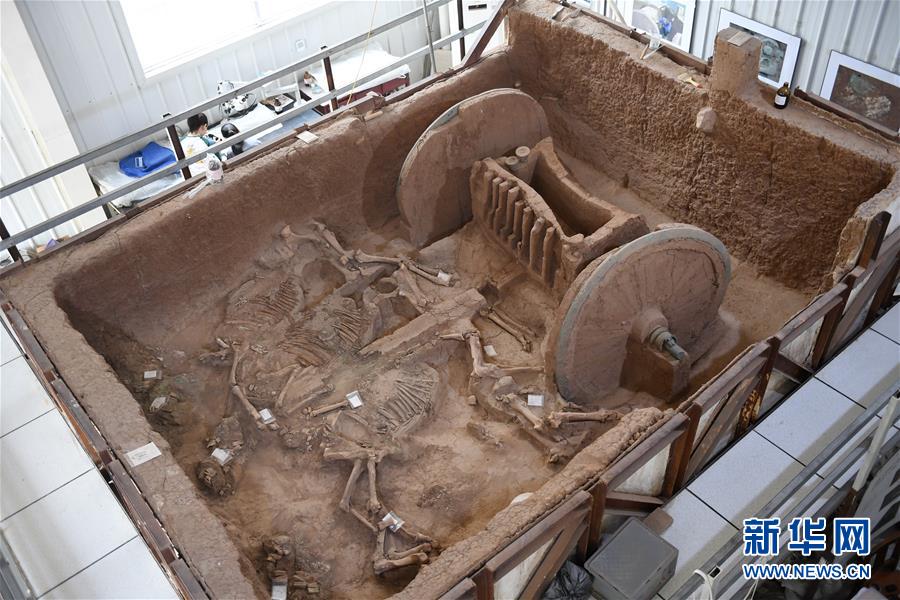 這是7月30日在陜西省考古研究院涇渭基地拍攝的西周晚期青銅輪牙馬車。經(jīng)過文物保護(hù)人員3年多連續(xù)不斷的保護(hù)修復(fù),一套總長超過3米的西周晚期青銅輪牙馬車已保護(hù)和復(fù)原完畢。這套青銅輪牙馬車2014年出土于陜西省寶雞市岐山縣周原遺址,馬車長3.13米、寬2.7米、高1.5米,車頭部位有4匹馬的遺骸。馬車車廂裝飾華麗繁復(fù),有大量鑲嵌綠松石的青銅構(gòu)件、薄壁青銅獸面裝飾以及玉器和彩繪構(gòu)件,車輪外沿全部由青銅鑄造而成,這也是目前唯一一套部件完整的青銅輪牙馬車。根據(jù)實(shí)驗(yàn)室提取的遺物和精確數(shù)據(jù),考古工作者按照原來的工藝、結(jié)構(gòu)對這輛青銅輪牙馬車進(jìn)行了同比例復(fù)原。這套青銅輪牙馬車的保護(hù)和復(fù)原,對研究西周晚期的禮儀及車輿制度有重要價值。新華社記者李一博攝