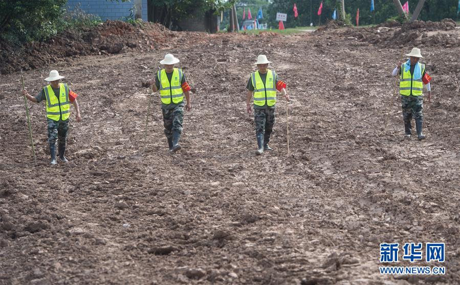 8月5日,夏德勤(左一)與同事在長(zhǎng)江武金堤背水面巡查管涌情況。新華社記者肖藝九攝