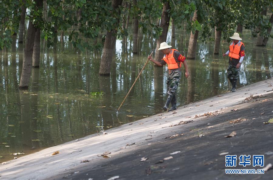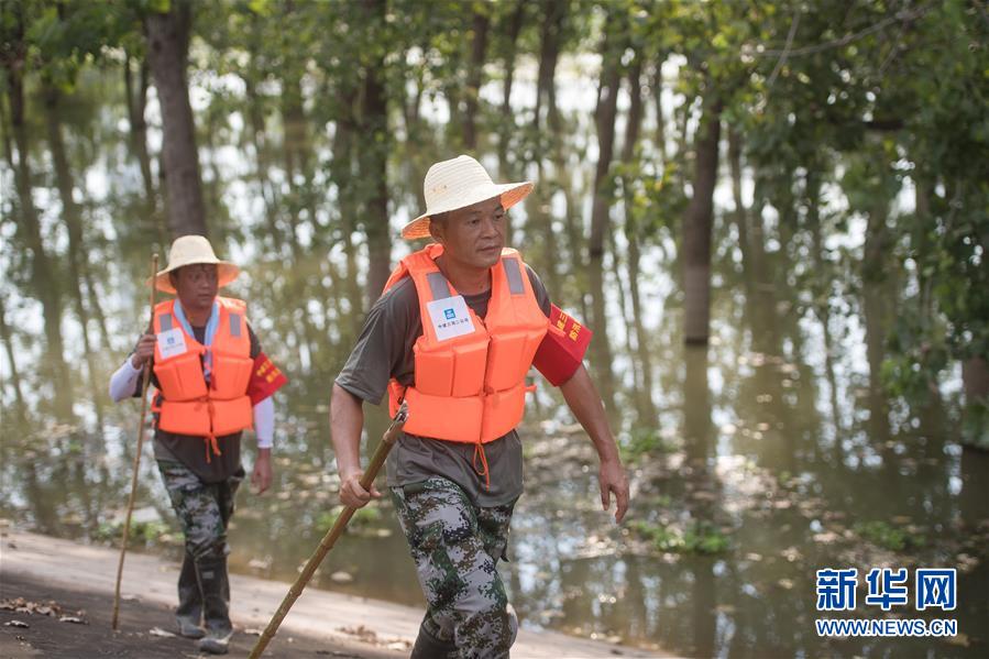 8月5日,夏德勤(左)與同事在長(zhǎng)江武金堤迎水面巡查。新華社記者肖藝九攝