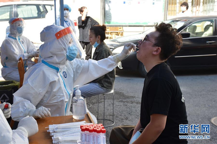 8月5日,醫(yī)務工作者在烏魯木齊市天山區(qū)山西巷社區(qū),對居民開展免費核酸檢測服務。新華社記者高晗攝