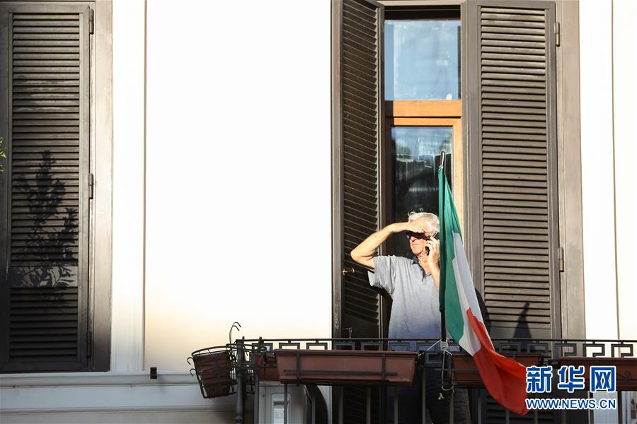 8月4日,在意大利首都羅馬,一名男子在陽(yáng)臺(tái)打電話。受新冠疫情影響,今年夏天羅馬的歷史中心區(qū)游客比往年明顯減少。新華社記者程婷婷攝