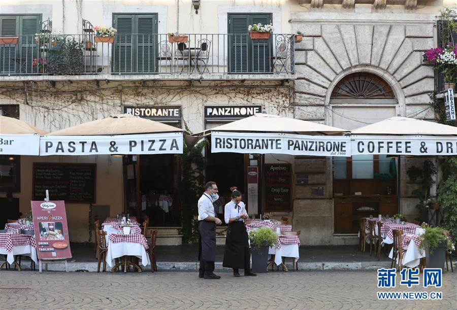 8月4日,人們?cè)谝獯罄锥剂_馬一家餐廳用餐。受新冠疫情影響,今年夏天羅馬的歷史中心區(qū)游客比往年明顯減少。新華社記者程婷婷攝