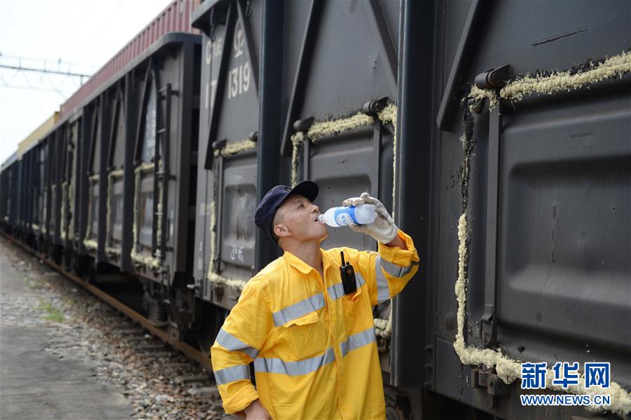 8月6日,合肥運(yùn)用車間列車檢修員在工作間隙喝水。合肥市近日持續(xù)高溫天氣。在中國(guó)鐵路上海局集團(tuán)有限公司杭州北車輛段合肥運(yùn)用車間,386名列車檢修工人頭頂烈日?qǐng)?jiān)守崗位,確保暑運(yùn)列車的安全運(yùn)行。據(jù)了解,暑運(yùn)期間,合肥運(yùn)用車間日均檢修列車105列,檢修車廂5058節(jié)。新華社記者黃博涵攝
