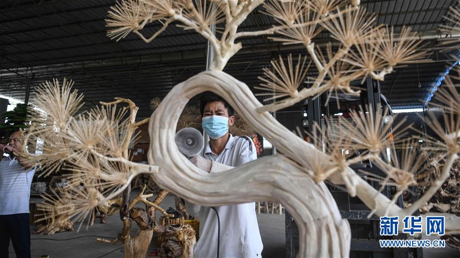 8月7日,工人在制作根雕工藝品。2017年以來,廣西桂林市永??h永安鄉(xiāng)通過幫扶返鄉(xiāng)青年創(chuàng)業(yè)的方式,建立起根雕工藝品就業(yè)扶貧車間,組織貧困群眾進車間務(wù)工學(xué)藝,把當(dāng)?shù)刎S富的朽木和柑橘樹根枝資源利用起來,加工成盆景、茶桌、吊燈等根雕工藝品,不僅幫助貧困群眾在家門口掌握一技之長,還讓他們在脫貧摘帽后實現(xiàn)穩(wěn)定增收。新華社記者張愛林攝