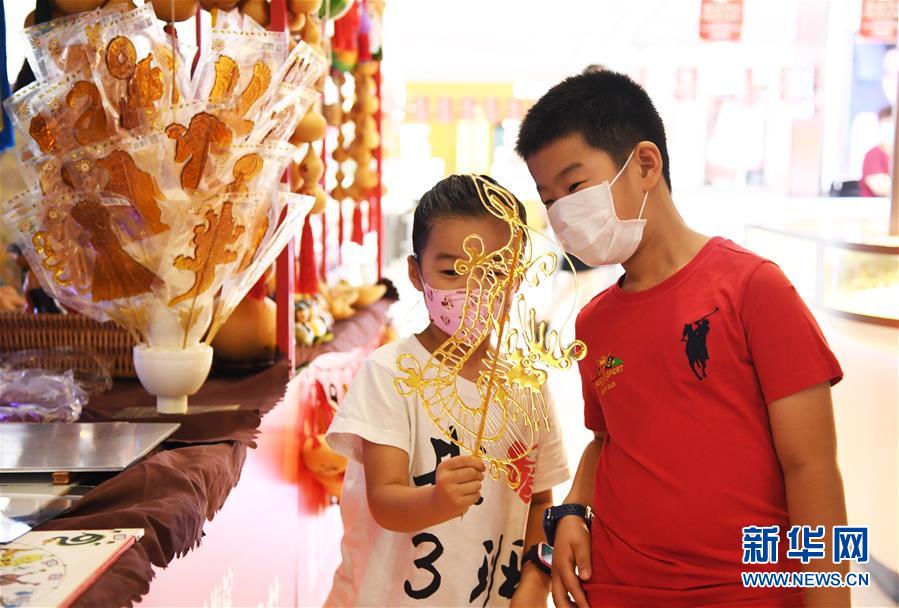 8月8日,兩名小朋友在第十八屆中關(guān)村國(guó)際美食節(jié)美食美酒嘉年華文創(chuàng)非遺展示區(qū)感受糖畫(huà)魅力。
