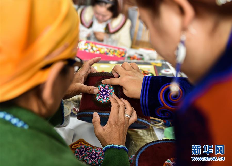 在內(nèi)蒙古自治區(qū)鄂溫克族自治旗巴彥托海鎮(zhèn)太陽(yáng)花傳承發(fā)展中心,艾吉瑪(右)和手工藝人交流制作工藝(8月6日攝)。新華社記者劉磊攝。