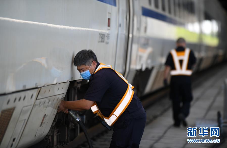 8月12日,長(zhǎng)春火車站客運(yùn)車間上水工王軍在給列車上水。進(jìn)入暑運(yùn)高峰,為了保障列車正常用水,每當(dāng)一列火車??寇囌荆L(zhǎng)春火車站的上水工就冒著酷暑將水管插進(jìn)火車底部的輸水口,快速準(zhǔn)確完成輸水作業(yè)。新華社記者 林宏 攝