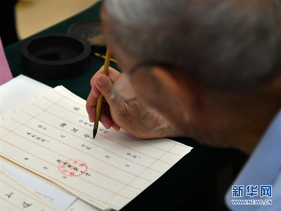 8月13日,陜西師范大學(xué)退休教師符有堂書寫錄取通知書。當(dāng)日,陜西師范大學(xué)2020年手寫錄取通知書正式開(kāi)筆。該校自2007年起采用毛筆書寫錄取通知書的方式,為新生傳遞佳音。今年,學(xué)校十余位退休教師、在職教師、校友代表等書法愛(ài)好者將為約4500名新錄取的本科生送上帶著墨香的大學(xué)錄取通知書。新華社記者張博文攝