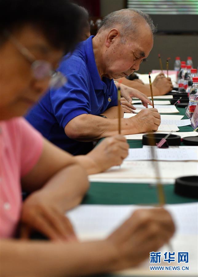 8月13日,陜西師范大學(xué)退休教師韓月娥(左二)等書寫錄取通知書。當(dāng)日,陜西師范大學(xué)2020年手寫錄取通知書正式開(kāi)筆。該校自2007年起采用毛筆書寫錄取通知書的方式,為新生傳遞佳音。今年,學(xué)校十余位退休教師、在職教師、校友代表等書法愛(ài)好者將為約4500名新錄取的本科生送上帶著墨香的大學(xué)錄取通知書。新華社記者張博文攝