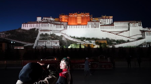 夜幕降臨,西藏拉薩布達拉宮燈光璀璨,夜景迷人。