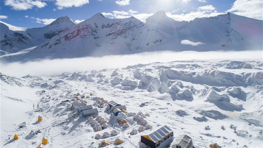 從空中俯瞰珠穆朗瑪峰北坡,生機勃勃的高原濕地、蜿蜒曲折的盤山公路、壯麗秀美的絨布冰川,還有安靜的村莊和熱鬧的登山營地,共同構成一幅壯美畫卷。