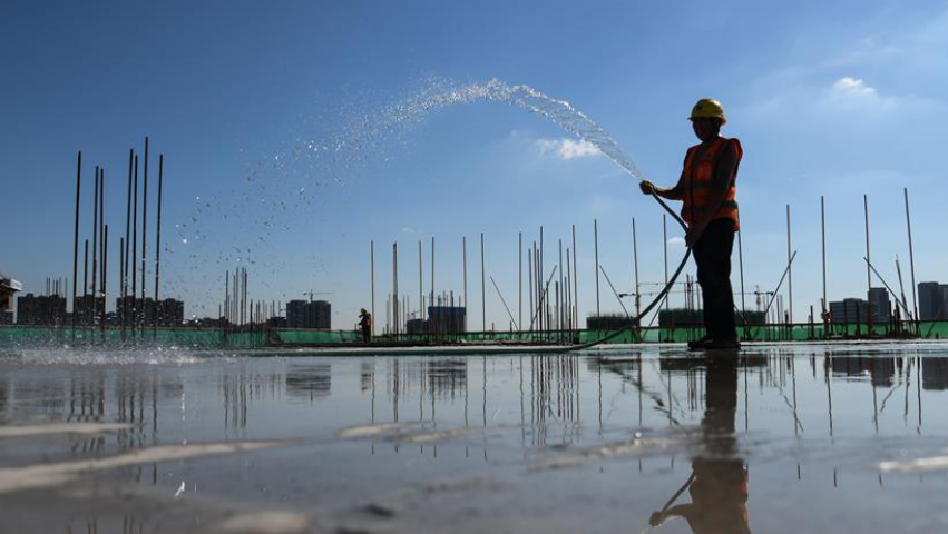 8月3日,工人在長江文創(chuàng)產(chǎn)業(yè)園項(xiàng)目工地工作平面澆水降溫。