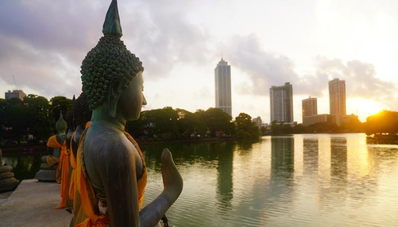 在科倫坡貝拉湖上有一座木造樓閣——水中廟。木造建筑上面覆蓋著藍(lán)瓦,外圍環(huán)繞著線條優(yōu)美的佛像。