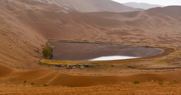 沙丘起伏的曲線陡變成高聳的沙山,碧藍的湖泊散落在沙海間。