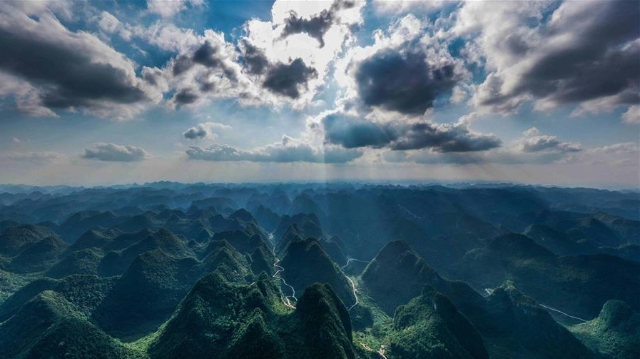 初夏時節(jié),在廣西桂林市陽朔縣興坪鎮(zhèn),藍天白云下,煙雨朦朧中,桂林山水盡顯秀美。