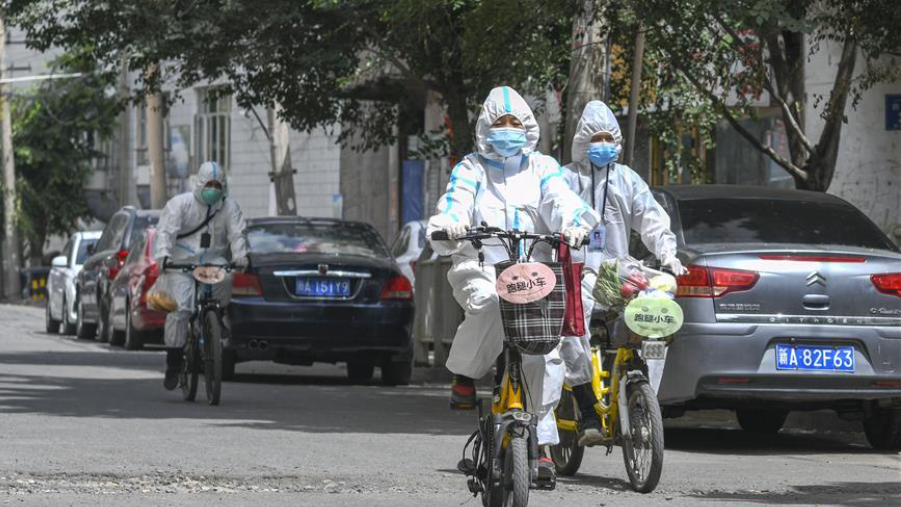 8月3日,在烏魯木齊天山區(qū)西河壩前街社區(qū),社區(qū)工作人員準備騎上”跑腿小車“為居民送去生活物品。