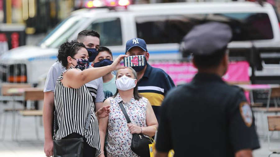 7月23日,人們戴著口罩在美國(guó)紐約時(shí)報(bào)廣場(chǎng)拍照留念。