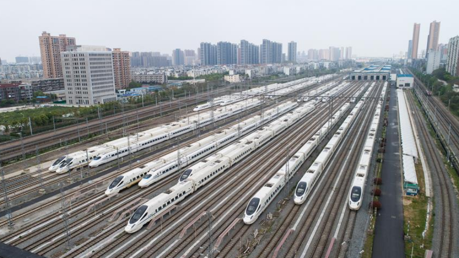 2020年4月6日,武漢動車段高鐵動車組整裝待發(fā)(無人機照片)。